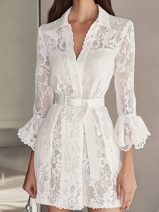 Beyaz Dantelli Kemerli Gömlek Elbise