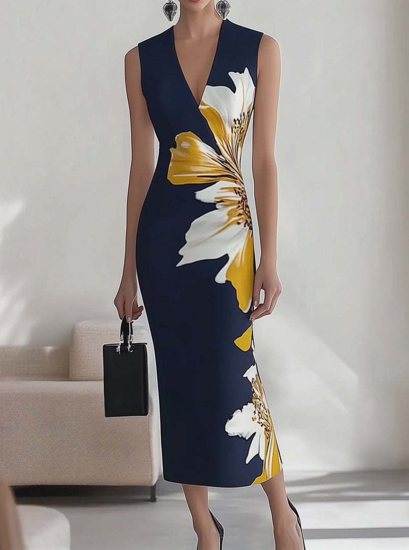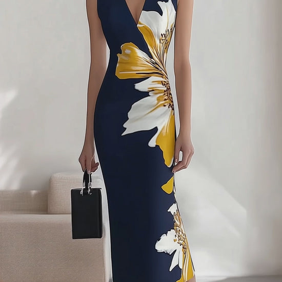 Lacivert V Yaka Çiçek Desenli Kolsuz Elbise